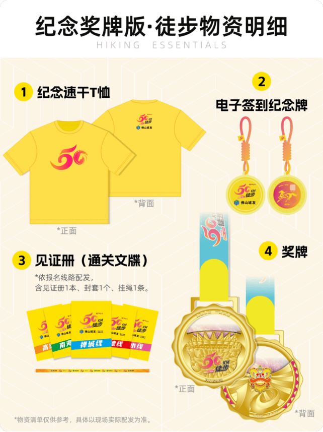 88元/份。含纪念速干T恤1件;电子签到纪念牌1个(与本人身份信息绑定,具有唯一性);见证册(通关文牒)1套,包含见证册1本、封套1个、挂绳1条;AI合拍电子照片1张;第十届佛山50公里徒步纪念奖牌1枚。同时可享受各站点饮用水补给、沿途站点基础医疗和救援、活动保险等服务。