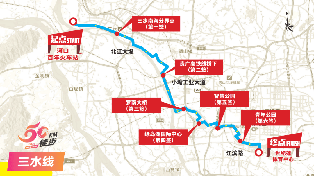 →西河路→北江大堤→威斯汀足球基地→北江体育休闲公园→北江大堤→江边仓→西南旧街→西南水闸→北江大堤→三水南海分界点(第一签)→北江堤围→沈海高速桥底→塘中路→北江东岸堤围→贵广高铁线下(第二签)→小塘工业大道→佛山大堤→罗南大桥(第三签)→河堤→同济大桥底→禅港路→绿岛湖国际中心(第四签)→科海东路→河堤→季华大桥→季华路→智慧新城→智慧公园(第五签)→河堤→忠信路→江滨路→青年公园(第六签)→江滨路→东平路→东平大桥→滨河景观公园→世纪莲体育中心(终点)。