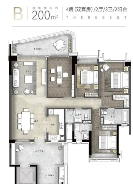 这款户型采用了三卧室朝南的设计,确保了每个房间都能享受到充足的阳光。双主套设计,为主卧和次卧都配备了独立的卫生间,提升了居住的私密性和便利性。独立电梯入户的设计,更是彰显了尊贵感,业主回家无需经过公共走廊,直接入户,安全又私密。