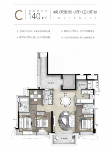 南天名苑的洋房产品主要集中在 R6-R9 栋,涵盖了多种户型设计,以满足不同家庭的需求。其中,建面约 140㎡的南向园景四房两厅三卫是最具代表性的产品之一。