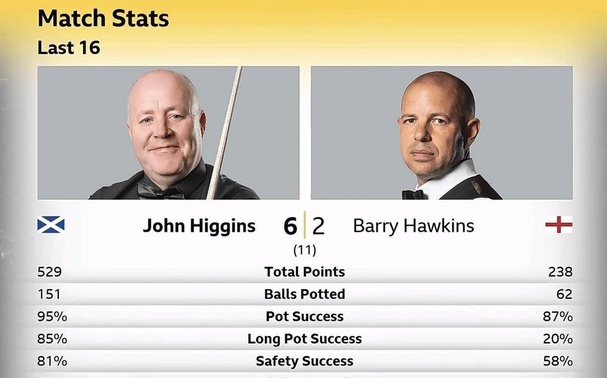 在当天最晚结束的一场比赛中,50岁的约翰·希金斯与46岁的巴里·霍金斯上演了两位老将之间的对决。 这场被球迷称为“经验之战”的比赛,最终也未能打破“6-2定律”。希金斯在开局0-1落后的情况下,打出了一波流畅的进攻高潮。