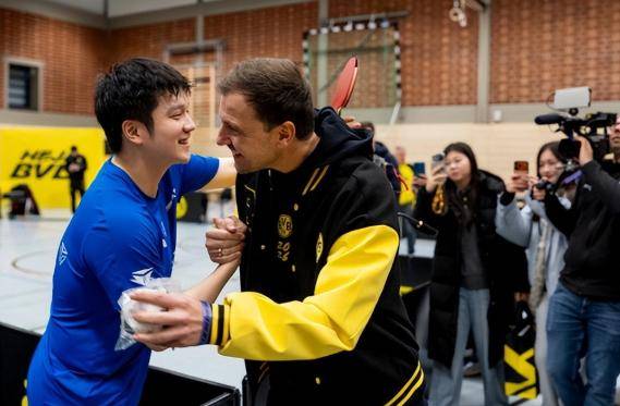 樊振东来德甲这半年,不是一开始就顺的。 去年8月底德甲首秀,他先输给了世界排名302位的法国选手鲁伊斯,又败给德国名将杜达。 那会儿他还在适应期,倒时差、用不熟悉的球台和球。 但他没找借口,反而加练,用发球机模拟各种旋转,每天练将近十小时。 到去年12月,他状态回来了,主场全胜,还拿了德甲月度最佳球员。 今年1月4日,他一天打四场全赢,帮萨尔布吕肯拿了德国杯冠军,自己也当选MVP。
